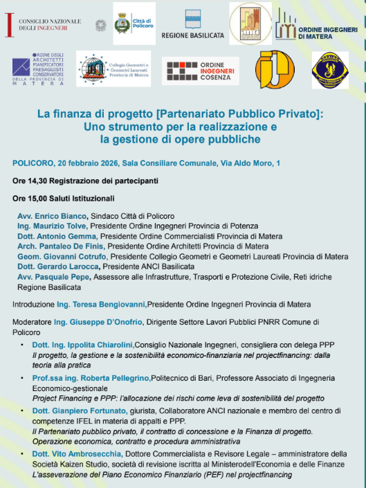 Seminario “La finanza di progetto (PPP): uno strumento per la realizzazione e la gestione di opere pubbliche” – Policoro, 20 febbraio 2026