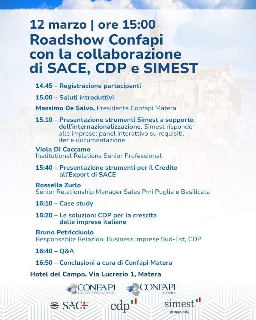 Il prossimo 12 marzo, alle ore 15.00 presso l’Hotel del Campo di Matera, si terrà una tappa del Roadshow CONFAPI – SIMEST – SACE.