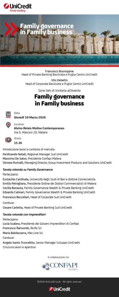 “Il passaggio generazionale rappresenta una delle sfide più delicate per il sistema produttivo italiano, in particolare per le piccole e medie imprese a forte radicamento familiare. In questo contesto UniCredit affianca gli imprenditori non solo con strumenti finanziari dedicati, ma anche con momenti di confronto e formazione che aiutino a trasformare una fase complessa in un’opportunità di crescita e continuità aziendale. Rafforzare la governance familiare significa infatti tutelare il valore costruito nel tempo, favorire decisioni strategiche più solide e garantire stabilità alle imprese e ai territori in cui operano”, dichiara Ferdinando Natali, Regional Manager Sud di UniCredit.