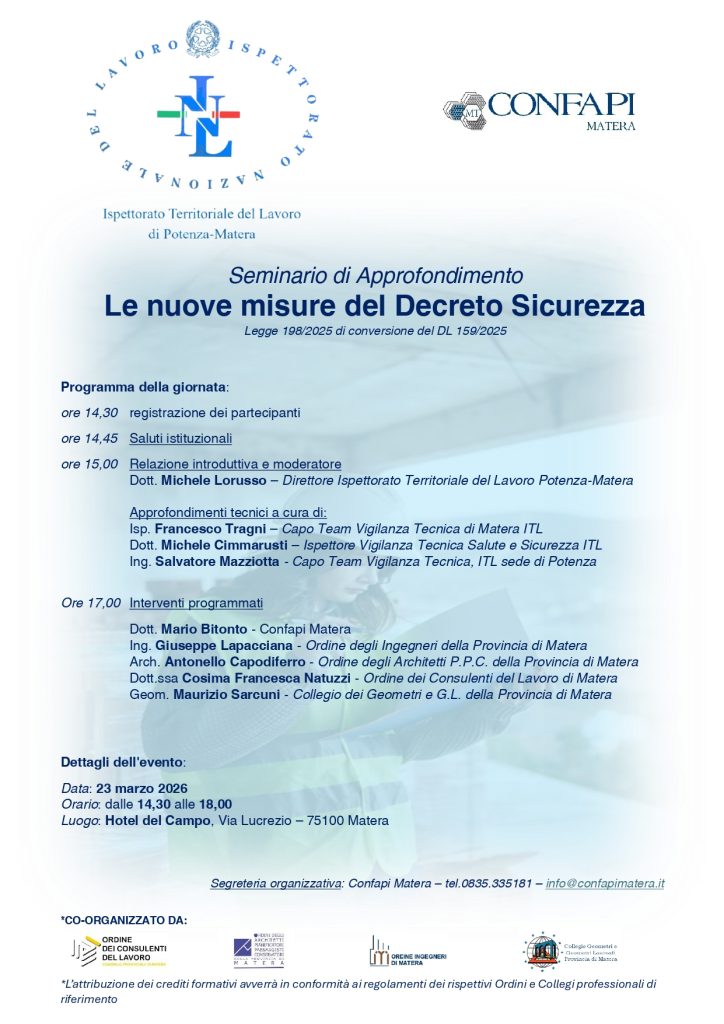 Il prossimo 23 marzo 2026, dalle ore 14,30 alle 18,00 presso l’Hotel del Campo di Matera, Confapi e Ispettorato Territoriale del Lavoro terranno un seminario di approfondimento tecnico e giuridico dedicato alle novità introdotte dal Decreto Sicurezza sul Lavoro (DL 159/2025 convertito dalla Legge 198/2025).