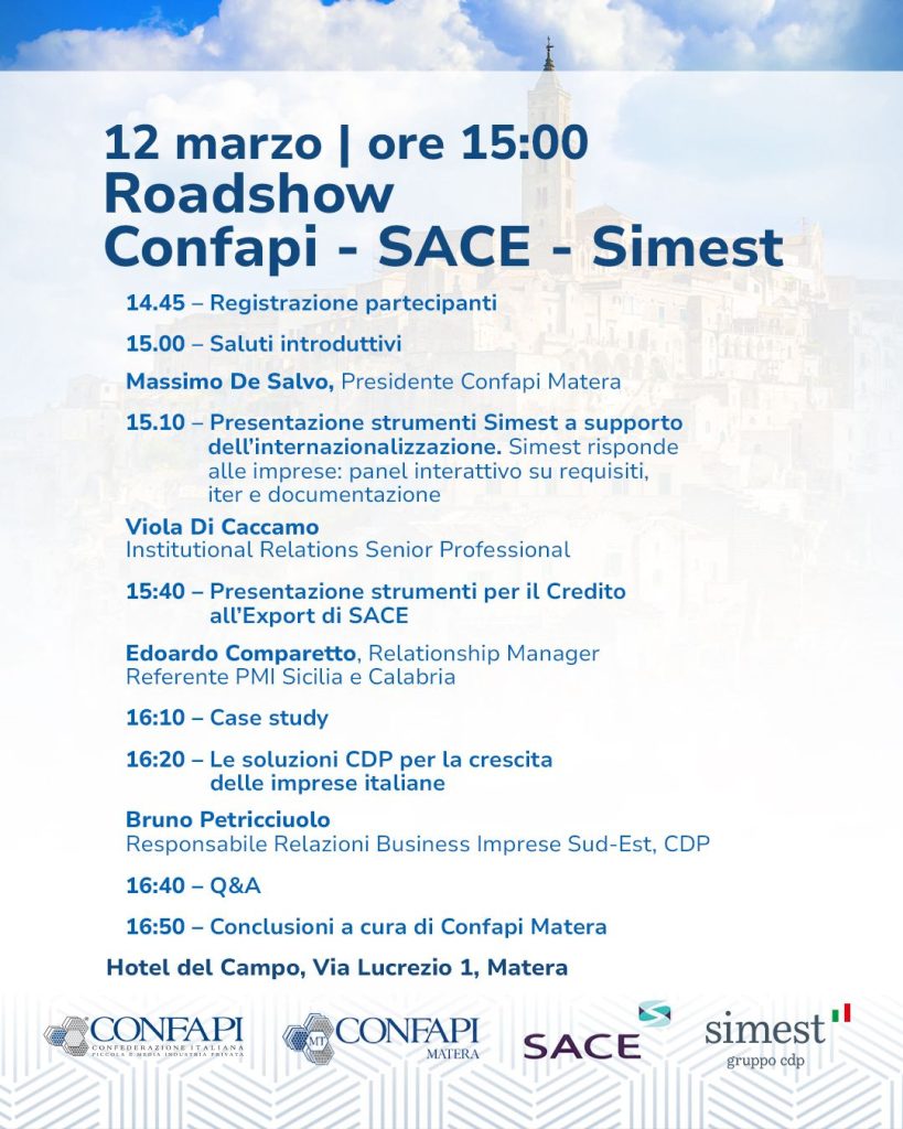 Il prossimo 12 marzo 2026, alle ore 15,00 presso l’Hotel del Campo di Matera, si terrà una tappa del Roadshow CONFAPI – SIMEST – SACE – CDP.